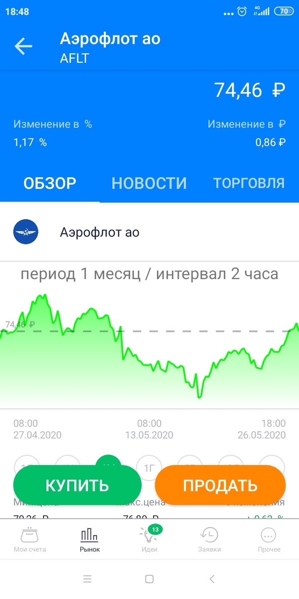 Я всех приветствую дорогие читатели на моём канале сегодня мы разберем очередной день по-моему инвестиционному портфелю. На вечерней торговой сессии российский рынок как следует распродали, на момент закрытия индекс Московской биржи подешевел на 0.14% индекс РТС подорожал на 0,95% по отношению ко вчерашнему дню, Рубль продолжает укрепляться 1 доллар стоит уже ниже 71 рубля. На закрытии биржи мой портфель оказался выше индексов РТС и Мосбиржи и прибавил 1.17% что при этом не могло меня не порадовать, а теперь разберемся подробнее какие акции на сколько подорожали Первой компанией в нашем списке будет Аэрофлот акции подорожали по отношению ко вчерашнему закрытию на один 1.17% Следующая компания новолипецкий металлургический комбинат, акции которого я покупал для получения дивидендов, на данный момент акции вышли в небольшой плюс средняя цена по позиции 130 руб за одну акцию. Цена на закрытие торгов составил 134 руб за одну акцию. На протяжении дня акции поднимались до отметки 136.44 за