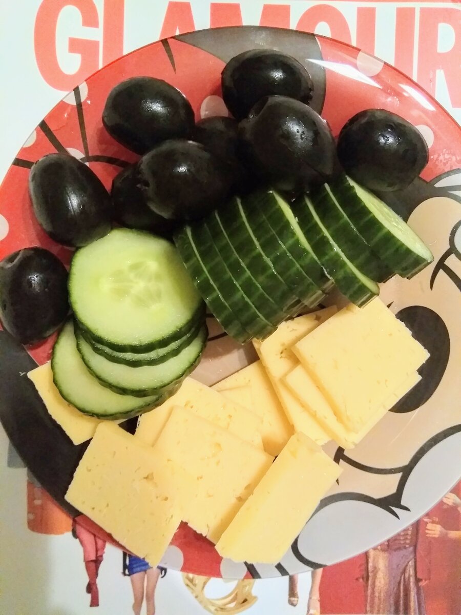 Вообще я стараюсь не есть за два-три часа до сна, учитывая то, что ужинаем мы ориентировочно в 19:00-19:30. Но иногда так и тянет что-нибудь перекусить. Из-за того, что тщательно контролирую съеденные калории, приходится потрудиться и найти именно то, что будет и сытно, и безопасно:) Почитав достаточное количество советов от диетологов, нашла отличный способ перекуса или даже мегалегкого ужина для худеющих - это тарелка с нарезкой из сыра, консервированных черных оливок (конечно, можно и зеленые), а также свежих огурцов. Объясняю почему: 1) Оливки, как всем уже известно, - это кладезь здоровья. В них содержатся витамины A, E, C, K, PP, группа витаминов B. В черных оливках есть антиоксиданты, которые способствуют выведению токсинов и продлевают молодость; 2) Сыр мягких сортов (совсем немножко). Во-первых, он насыщает. Во-вторых, это источник кальция и незаменимых аминокислот; 3) Свежий огурец. В данном случае он выполняет освежающую функцию и, конечно, утоляет жажду. Еще его важным плюс
