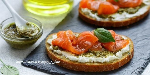 Приготовление Хлеб смажьте творожным сыром, а затем песто. Сверху выложите красную рыбу и украсьте базиликом.