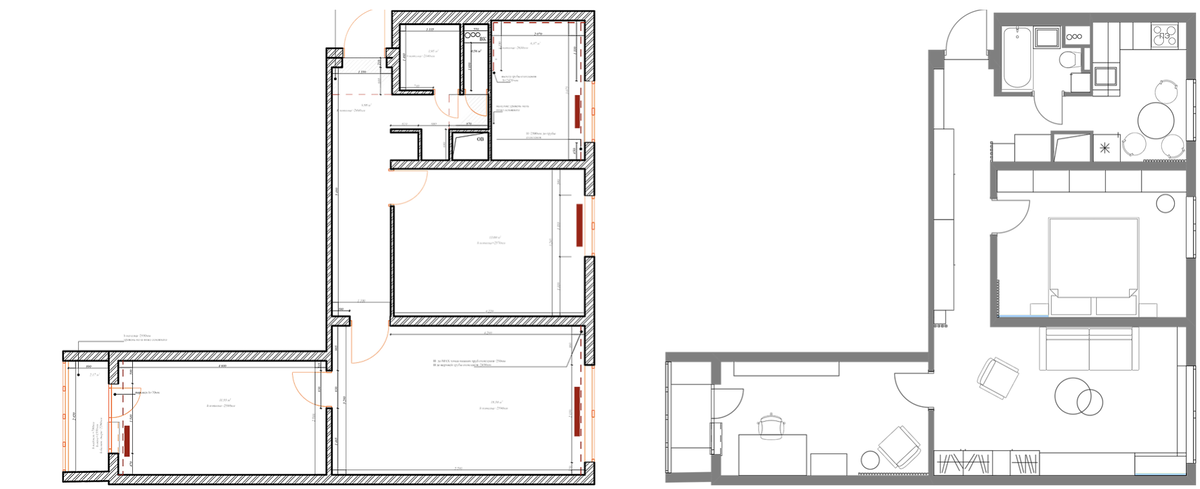Ребята молодые и энергичные, которые часто путешествуют по работе, хотели светлую квартиру без лишней мебели в которой можно отдыхать. #Перепланировку мы почти не делали, только объединили санузлы, убрали дверные проемы, ведущие на кухню и в гостиную, демонтировали встроенный шкаф в коридоре и сместили вход в спальню. Одним из вариантов планировочного решения был также размещение спальни где на утвержденном плане гостиная, а гостиной где на плане выше спальня, но Заказчики предпочти другой вариант. Дальняя от кухни комната в перспективе станет детской, а пока там кабинет, который по различным соображениям показывать не буду, именно поэтому мы с вами рассматриваем эту квартиру в рамках сегодняшней беседы как "двушку"