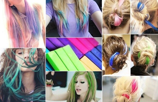 МЕЛКИ ДЛЯ ЯРКИХ ОТТЕНКОВ Если нужно сменить цвет буквально за пару минут, смело берите мелки! Они легко наносятся, быстро смываются простой водой и не оставляют следов. С их помощью вы сможете окрасить кончики или отдельные локоны в синий, красный, желтый или любой другой тон. А чтобы мелки не навредили здоровью волос, покупайте их только в официальных магазинах и действуйте строго по инструкции. Вы можете применять как жидкие мелки-тени, так и сухую пастель. Первый вариант дороже, но и пользоваться ним будет в несколько раз проще.