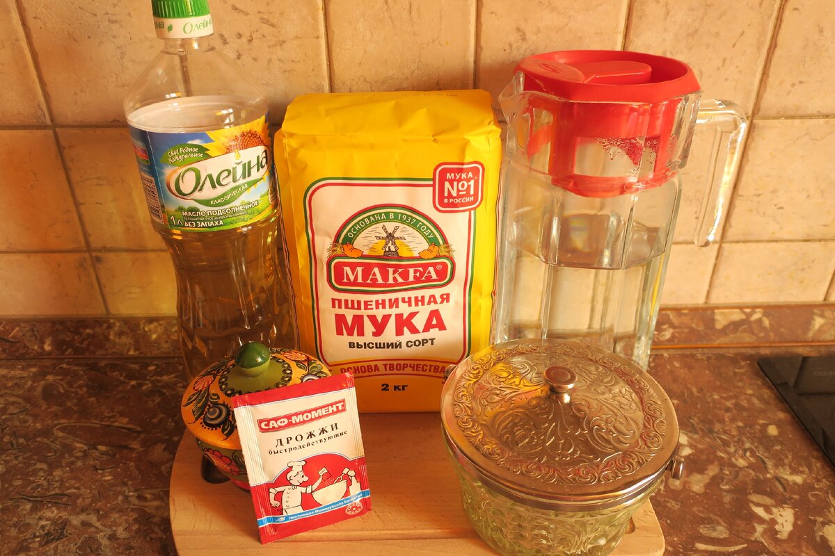В емкость просеиваем муку, но не всю. Добавляем соль, сахар, дрожжи, воду, растительное масло. Замешиваем тесто, постепенно добавляя оставшуюся муку.