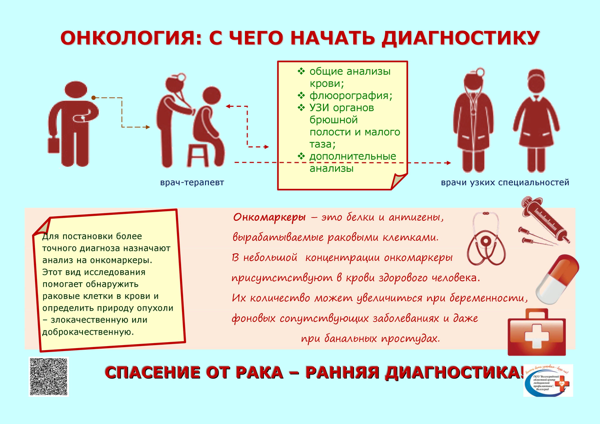 Это могут быть лабораторные анализы и инструментальные исследования — МРТ, КТ, эндоскопические исследования (ФГДС, колоноскопия). При подозрении на рак пациента направляют на приём к онкологу, где решается вопрос о проведении гистологического исследования.