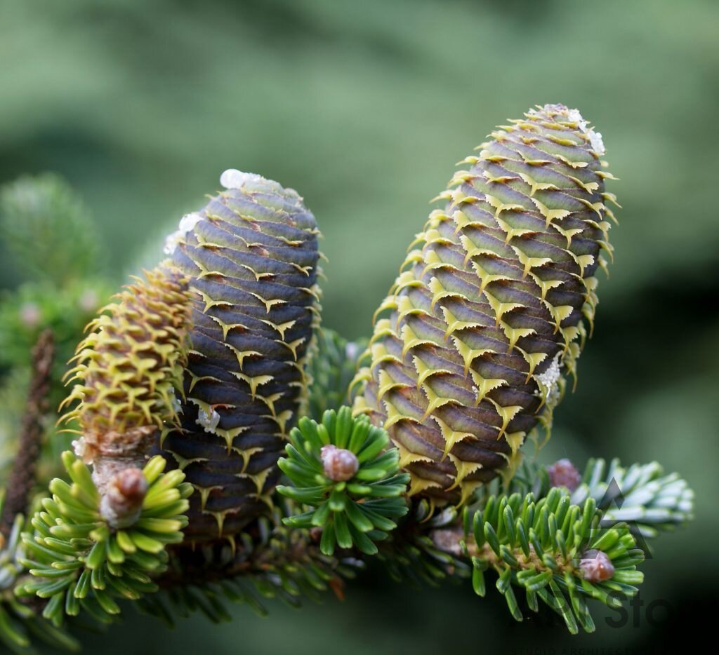 Семена пихты – шишки темно-зеленого цвета длинные, прямостоячие цилиндрической формы при созревании часто рассыпаются.
