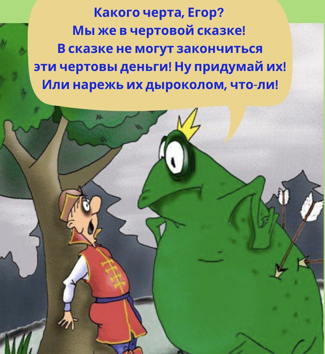 — Какого черта, Егор? Мы же были в чертовой сказке! В сказке не могут закончиться эти чертовы деньги! Ну придумай их! Или нарежь их дыроколом, что-ли!