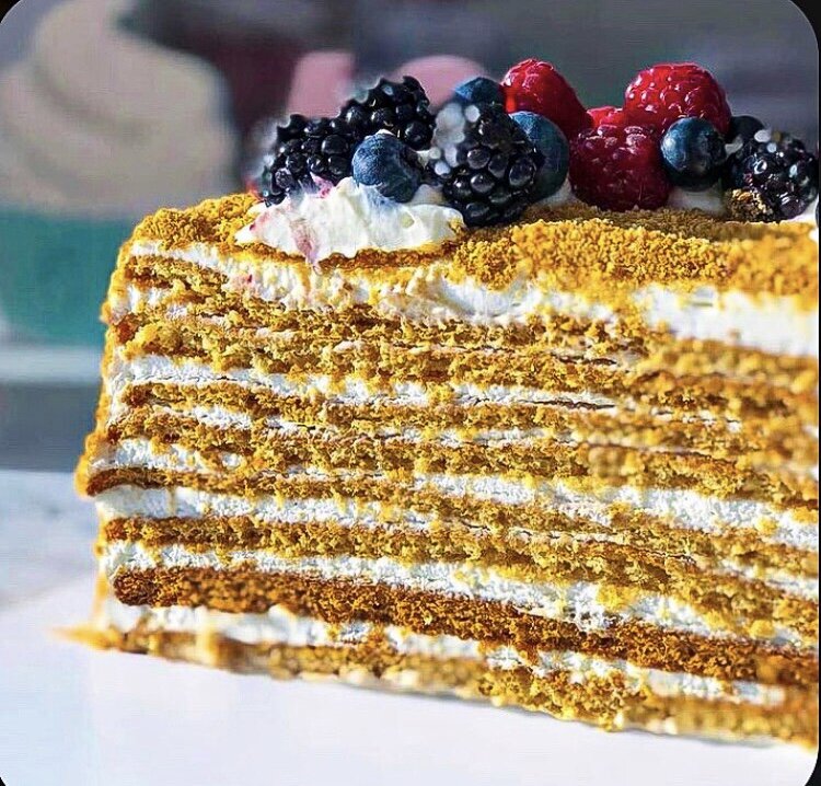 Ингредиенты: ДЛЯ КОРЖЕЙ: 2 яйца 200 грамм сахара 70 грамм размягченного сливочного масла 2 столовые ложки мёда 2 чайные ложки соды щепотка соли 550 грамм муки ДЛЯ КРЕМА: 400 грамм Сметаны 25% и более жирности 500 грамм варёной сгущенки Порядок приготовления: 1. В жаростойкой миске смешать масло, сахар, яйца и мед. Поставить миску на водяную баню и постоянно помешивая нагреть смесь до полного растворения сахара. 2. Снять однородную смесь с огня, добавить соль, соду и интенсивно перемешать. 3. К смеси добавить муку и замесить тесто. Как только тесто соберется в шар, вымесить его на рабочей поверхности до эластичного состояния. Тесто в начале будут похожим на песочное, но затем станет более гладким и перестанет липнуть к рукам. 4. Разделить тесто на 8 частей. Каждую часть тонко раскатать и выпекать по очереди при температуре 200 С в течении 3-5 минут до золотисто-коричневого цвета. Как только один корж испечется, переложить его на стол и сразу же вырезать из него круг нужного диаметр