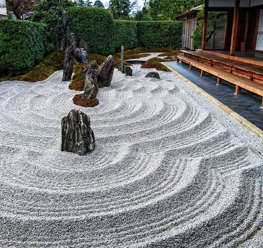 Насыпь песка или гальки, валуны... Японский сад камней — замечательное место для созерцания природной красоты. Главный элементов садов дзэн, как ни странно, хаотично расположенные камни. Но на самом деле хаотичность расположения подчиняется правилам дзэн-буддизма. Согласно концепции, число камней в группе всегда нечётное. Они имеют вулканическое происхождение, а также по форме напоминают треугольник. Одна из основных особенностей сада: наблюдающий с разных ракурсов видит одинаковое число камней, но один из камней всегда остаётся скрытым. Считается, что насыпь гальки символизирует море или океан, а булыжники — острова.