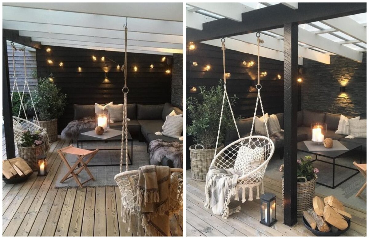 Летом без террасы в собственном доме не обойтись. Ведь это место, где ваша семья будет проводить больше всего времени. Как приятно завтракать, обедать и ужинать на природе. Почитать книжку в тени террасы, уложить ребенка спать на свежем воздухе. отделка из дерева придает террасе уют. Своей теплой палитрой она сливается с природой и терраса уже становится продолжением ландшафта, плавно переходящим в дом. Используйте уличные диваны с подушками, мягкие уличные кресла, столики, ковры, светильники, пледы - все это придает уют и сделает вашу террасу максимально комфортной для всех членов семьи. Подвесные кровати - очень интересный предмет интерьера террасы. Думаю такая кровать станет любимым местом не только детей, но и взрослых. Да и бабушка с дедушкой с удовольствием вздремнут на такой кроватке. Максимально используйте озеленение на террасе. Ведь терраса это в большей степени часть сада, чем часть дома. Поставьте комнатные цветы на террасу или выделите специальное место под посадку растени