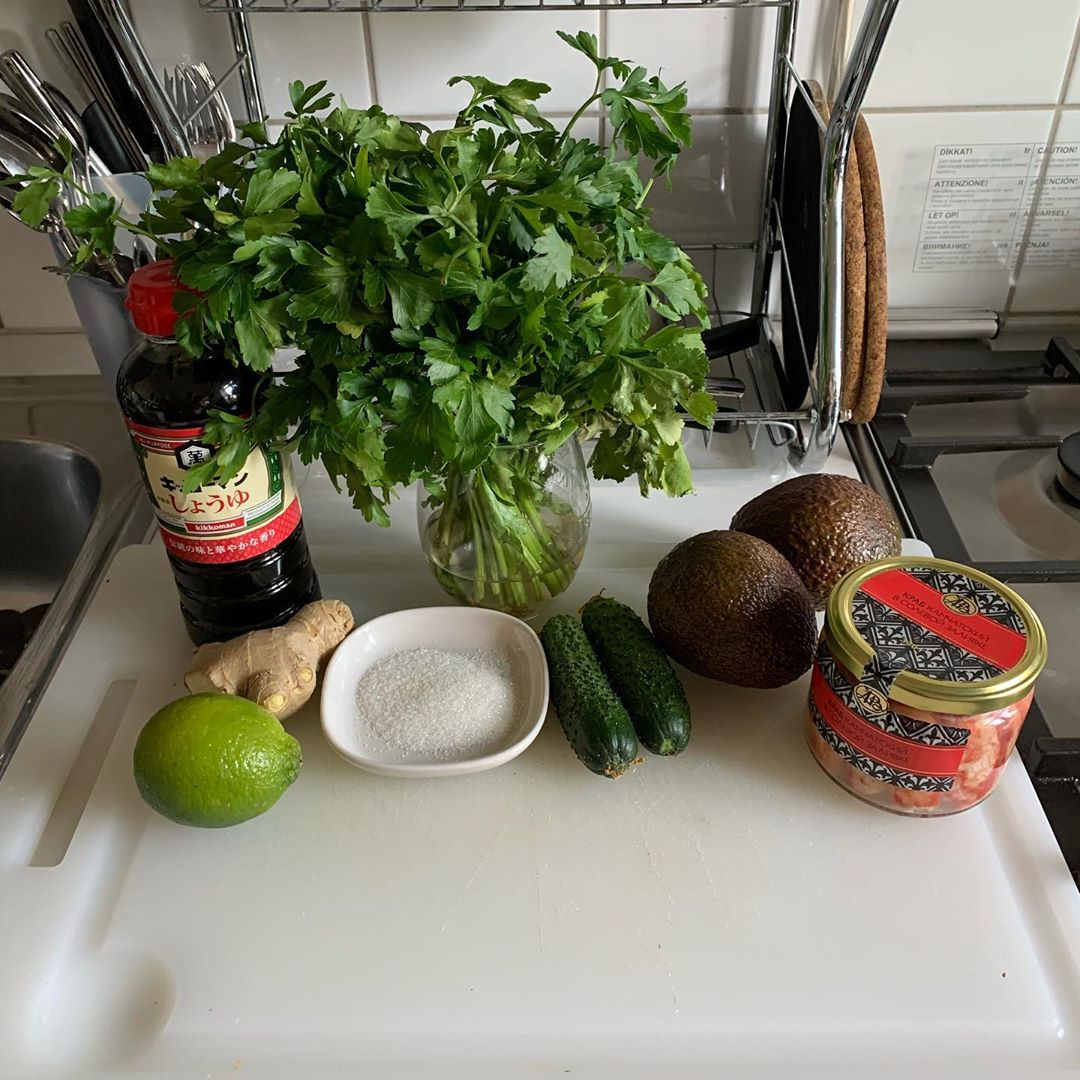 4. Соединяем и перемешиваем огурец, авокадо и крабовое мясо. Можно сразу влить всю заправку, а можно подать ее отдельно.