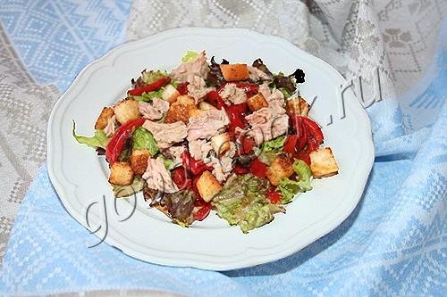 Лёгкий, сытный и вкусный салат. Приятную нотку во вкус вносит болгарский перец - от кратковременного тушения он становится мягковатым снаружи, но остаётся хрустящим внутри. Золотистые сухарики добавляют салату сытность и сливочный аромат. Категория: Салаты с рыбой и морепродуктами, Диетические и малокалорийные рецепты СОСТАВ На 4-5 порций: 1 средний болгарский перц (100~130г), 0,5 банки тунца, 2 ломтика батона (30~40г), 20г сливочного масла, 1 ч ложка лимонного сока или яблочного уксуса, пучок садового салата (~100г) ЗАПРАВКА 2 ч ложки ягодного или винного или яблочного уксуса, 3~4 ст ложки растительного масла, 1/4 ч ложки соли, щепотка черного перца посмотреть калорийность»