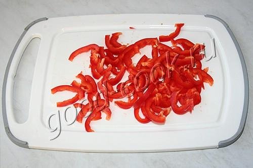 Болгарский перец вымыть, разрезать на 4 части, вырезать семена, нарезать тонкой соломкой. Ломтики батона нарезать маленькими кубиками. В сковороде на среднем огне разогреть сливочное масло и выложить кубики батона.