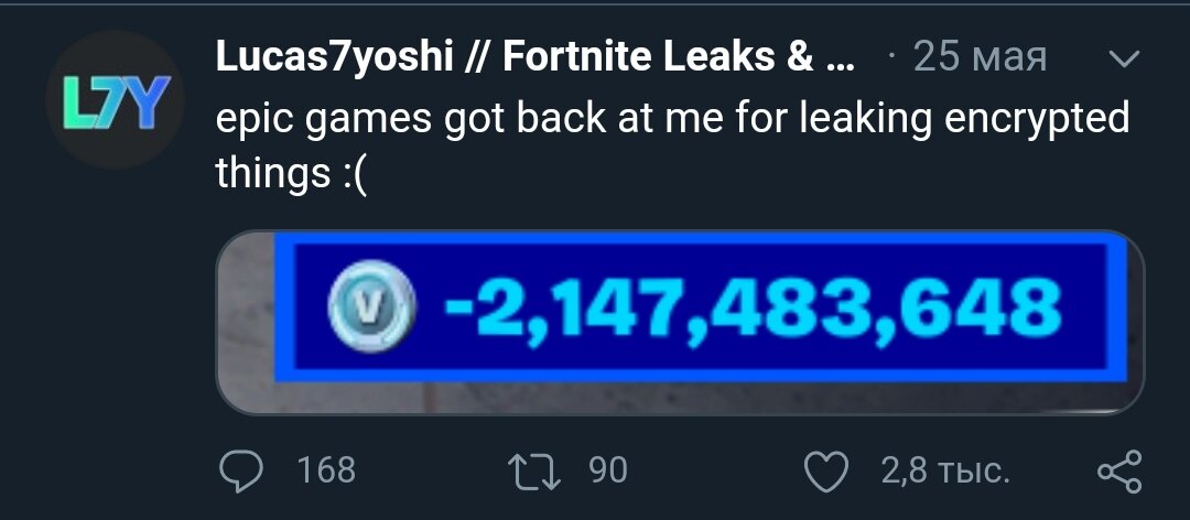 Датамайнер Lucas7yoshi разместил видео, в котором показал все косметические предметы для Fortnite, что игроки получат вместе с патчем 12.60. Разработчикам естественно это не понравилось, поэтому компания поставила на Лукаса задолженность в виде 2 миллиардов V-Backsов, для оплаты которых ему потребовалось больше миллиарда рублей. Это немыслимо, но справедливо! «Epic Games отомстила мне за то, что я сливал зашифрованные данные» - пишет Лукас в своем твиттере. Удивительно, но датамайнера это не остановило, он продолжил выкладывать зашифрованные файлы в свой аккаунт в твиттере. У него кстати там 230 тысяч подписчиков.