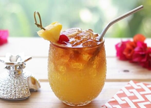 Добрый день, дорогие читатели. Сегодня мы с вами научимся готовить коктейль под названием "Май Тай". Этот чудесный напиток настолько хорош, что был включен в сборник Международной ассоциации Барменов в 1987 году. Название напитка дали жители Таити. Впервые попробовав его, они воскликнули Май Тай, что переводится, как "Божественный". Приступим к приготовлению. Для начала приготовим все нужные ингредиенты: 1. Белый ром - 40мл, черный ром - 20мл 2. Апельсиновый ликер - 20мл 3. Сок лайма - 15мл 4. Миндальный сироп - 10мл 5. Апельсиновый сок - 25мл 6. Ананасовый сок - 30мл 7. Лед на пол бокала После того, как все подготовлено, берем шейкер и вливаем в него белый ром, ликёр и сок лайма. Взбалтываем около минуты, затем добавляем туда миндальный сироп и вновь смешиваем. Возьмите охлажденный бокал и наполовину заполните его льдом. Налейте в него содержимое шейкера и сверху 20мл черного рома. Перемешивать не нужно. Добавляем в бокал оба сока: ананасовый и апельсиновый. Вуаля и коктейль г