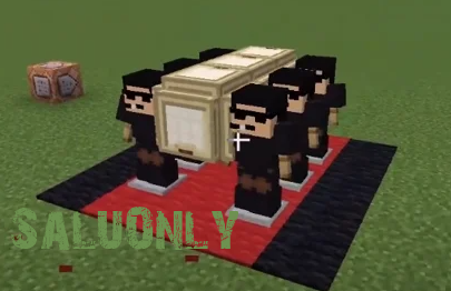 Танцующие гробовщики в Майнкрафте уже появлялись в виде необычного мода, в котором зомби со своей анимацией провожали мертвого своими танцами, радуясь его участи. Теперь, появилась возможность сделать танцующих гробовщиков в Minecraft без модов, что поистине удивительное нововведение, которое не заставит себя ждать. Все, что нам понадобится в игре - это специальная голова, полученная при помощи командного блока, а для того, чтобы получить голову из командного блока, нужно им воспользоваться, поставив на упругую поверхность. После, введите эту команду: /give @p minecraft:player_head{display:{Name:"{\"text\":\"Boy\"}"},SkullOwner:"Aura89"} 1 Затем, нужно нажать на кнопку или рычаг, кому что больше нравится, которую нужно предварительно поместить на командный блок, и тогда, в вашем инвентаре появится голова гробовщика в Майнкрафт. Нам непременно нужно сделать платформу, на которой будут стоять гробовщики, но, к сожалению, они танцевать не будут, зато будут являться отличной декорацие