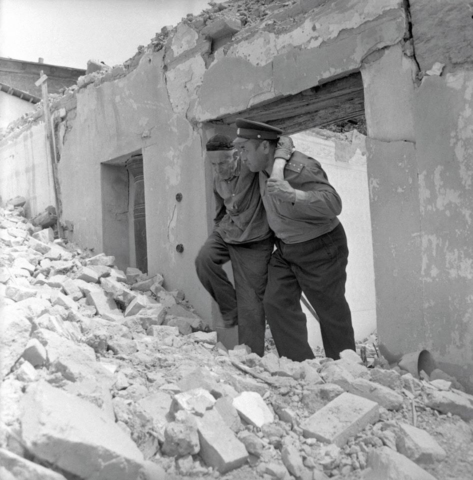 Ликвидация последствий землетрясения в Ташкенте. Капитан милиции Шамахсуд Шарахмедов помогает выйти жителю из разрушенного дома. Автор фото: Дмитрий Чернов ©️Tashkent Retrospective Ещё больше интересного в нашем телеграмм канале: http:/ t.me/theunicouz