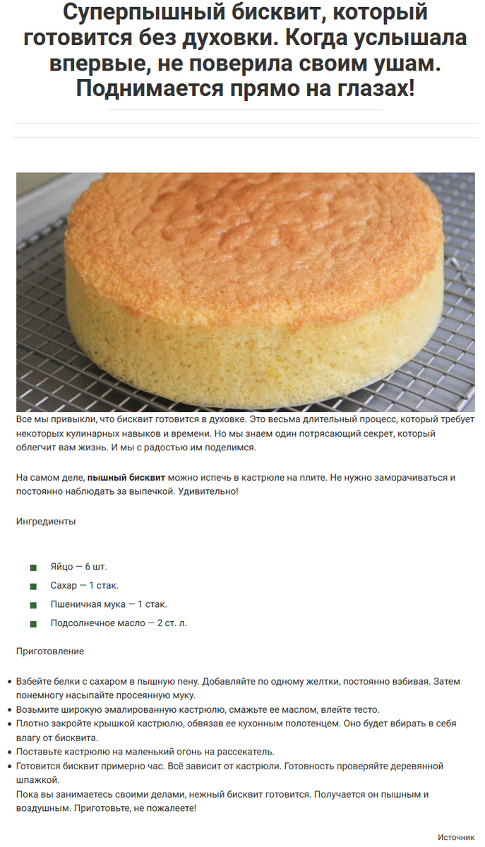 https://dirteam.ru/2020/04/19/superpyshnyy-biskvit-kotoryy-gotovitsya-bez-duhovki-kogda-uslyshala-vpervye-ne-poverila-svoim-usham-podnimaetsya-pryamo-na-glazah/ По данному рецепту предлагается испечь бисквит в кастрюле на плите. И вот мой первый опыт: Я следовала рецепту: - Взбила белки с сахаром в пышную пену, добавляя и постоянно взбивая по одному желтки. Затем понемногу насыпала просеянную муку в чашу с пенкой. - Подготовила эмалированную кастрюлю, смазала ее маслом и влила полученное тесто. - Плотно закрыла крышкой кастрюлю, обвязав ее кухонным полотенцем. - И поставила кастрюлю на маленький огонь (на троечку). Т.к рассекателя у меня нет, использовала вместо него подходящую по размерам железку. Итог: Через час бисквит подгорел снизу (кастрюля почернела). Сам же он до конца не приготовился (был синеватого оттенка). Т.о дальше готовить не стала, т.к бисквит еще сильнее бы сгорел. Возможные ошибки: