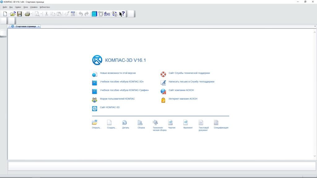 После загрузки программа КОМПАС-ЗD предлагает выбрать режим работы. При этом доступные режимы работы представлены в нижней части окна по команде Создать или при помощи выделенных команд Чертеж, Фрагмент, Текстовый документ, Спецификация, Сборка и Деталь. Щелчком мыши выберите нужный режим и вы в него перейдете.