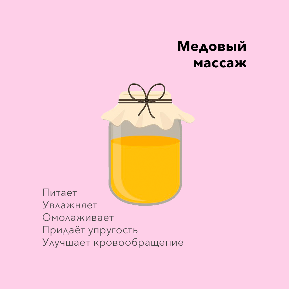 Вы когда-нибудь мазали лицо мёдом? А попу? Медовый массаж это пипец как полезно. Мёд питает, увлажняет, омолаживает, улучшает кровообращение и делает кожу упругой. В мёде много фруктозы и глюкозы — сахаров, которые дают прилив сил и бодрости. Кроме сахаров, мёд содержит комплекс полезных веществ: органические и фруктовые кислоты, которые ускоряют обновление кожи; витамин С – омолаживает; витамины группы В улучшают микроциркуляцию и тонус сосудов; аминокислоты и минералы отвечают за регенерацию клеток и укрепление кожи. И это ещё не всё! Согласно исследованиям мёд помогает в борьбе с кожными инфекциями, обладает антимикробными и противовоспалительными свойствами, т.е. мёд используют даже в борьбе с прыщами и псориазом. Я черпаю мёд рукой из банки, обмазываюсь, жду пару минут, чтобы мёд загустел, и делаю похлопывающий массаж в течение 10-15 минут. Далее принимаю контрастный душ и кайфую от результата. Массируйте лицо осторожно, чтобы не повредить сосуды. После первой процедуры уменьшится