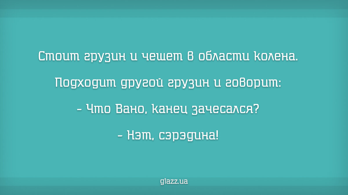— Кинжал мне в задницу! А… а… а… * * * * * * Подходит к водителю "Мерса" грузин и говорит: - Слушай, дорогой, у меня к тебе большая просьба будет. Подъедь во-он к той гости