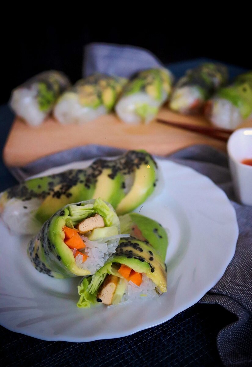 ИНГРЕДИЕНТЫ рисовая бумага - по мере необходимости авокадо - 2 шт огурец салат-1/2 шт морковь - 2 шт салат Айсберг - 4 листа тофу маринованный - 1 пакет лапша рисовая-50 г семена кунжута не нужно-по мере необходимости соус кисло-сладкий-по вкусу ПРОЦЕДУРА ПРИГОТОВЛЕНИЯ 1.Приготовим лапшу по инструкции. (Положить в миску, залить кипятком, оставить на 5 минут, процедить). 2.Нарежьте тофу тонкими полосками и обжарьте на сковороде. 3.Затем просто очистите огурец, морковь и авокадо. А вместе с салатом тоже нарезать тонкими полосками. 4.Когда у нас все готово, мы можем приступить к упаковке рулонов. 5.Рисовую бумагу нужно всегда замачивать, поэтому хорошо подготовить миску или тарелку с водой. 6.В нижнюю часть бумаги, кладем авокадо, на него салат и огурец, на все это кладется лапша, морковь и тофу. 7.Сначала складываем нижний край, затем боковые стороны, а потом уже скатываем до образования рулона. 8.Подавать с любимым соусом, сальсой и т. д.