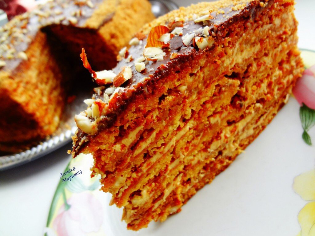 В отдельной кастрюле смешать мед, масло и соду. Поставить на средний огонь, помешивая растопить. Масса будет пениться и увеличиваться в объеме. Продолжая помешивать довести смесь до карамельного цвета (я чуть передержала, на вкусе это не отразилось).