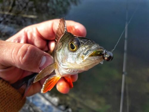 В июне после прошедшего нереста окунь разбивается на стаи небольшого размера и направляется к местам летнего обитания. Как правило, окунь среднего размера составляет самую крупную стаю. Обычно его можно обнаружить на мелководных участках водоёма, где держится основная пища окуня — малёк. Как следует из рассказов рыболовов ловля окуня в июне чаще всего ведётся в поверхностных горизонтах воды, где может питаться мелкий и средний окунь. В большинстве случаев встретить окуня в июне можно на участках водоёма с прозрачной водой, где дно завалено корягами и камнями. Среди перспективных мест для ловли трофейных экземпляров в июне можно отметить крутые бровки у берега, перекаты с твёрдым дном и закоряженные участки глубиной до 8 метров. Обнаружить окуня в июне во время охоты можно на участках водоёма, заросших водорослями, на различных бровках и ямах, вблизи свай мостов и плотин. Особи крупного размера ведут одиночный образ жизни, они стоят на значительном удалении от берега и охотятся на г