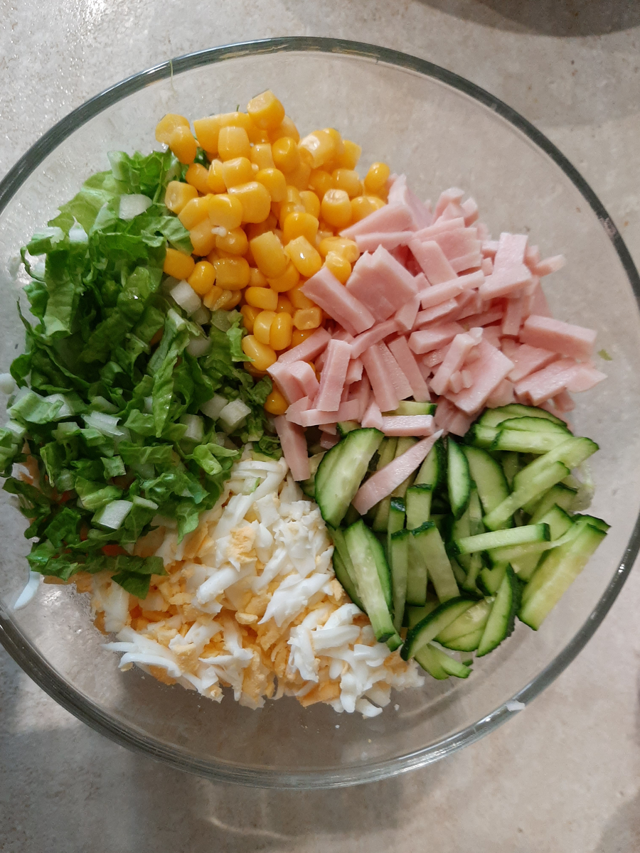 Сегодня я расскажу вам, как можно быстро приготовить вкусный лёгкий салат "Неженка". Многие называют этот салат "Нежность", они в принципе похожи своими ингредиентами, но всё таки разные. Итак, для приготовления нам потребуются следующие ингредиенты: Вместо ветчины можно взять отварную курицу, но с ветчиной мне он кажется нежнее. Для начала ставим отвариваться яйца, которые потом натираем на крупной тёрке прямо в салатник, хотя можно и порезать. Пекинскую капусту нарезаем как можно мельче, можно конечно взять только зелёные листья, но с белыми черешками салат будет сочнее. Огурец и ветчину я нарезаю мелкой соломкой, но можно сделать любую нарезку ингридиентов на ваш вкус. Из банки с кукурузой сливаем жидкость и добавляем её в салат. Вот такой яркий весенний салат у нас получился. Соль и майонез добавляем по вкусу. Приятного аппетита и подписывайтесь на мой канал.
