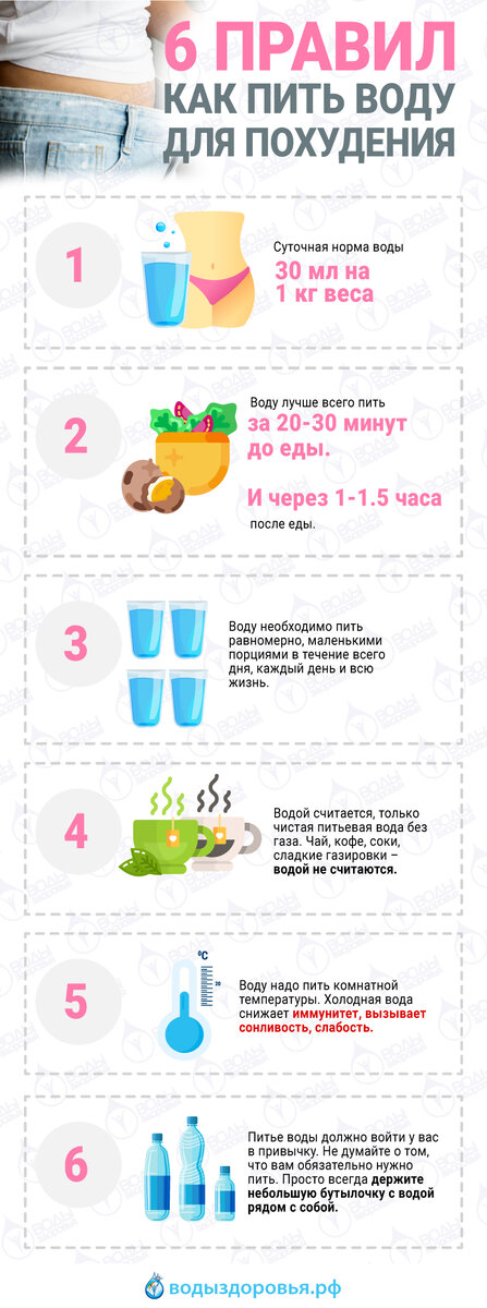 6 правил как пить воду для похудения Что бы сбросить лишний вес, похудеть и при этом остаться красивыми и свежими, иметь хорошую и эластичную кожу, красивые густые волосы и крепкие ногти необходимо помнить о воде. В процессе похудения очень часто страдают именно волосы,кожа и ногти. Чем же помогает нам вода, когда мы стараемся похудеть? Сколько пить воды, чтобы похудеть? В среднем 30 мл на 1 кг веса. Если вы весите 70 кг, ваша норма воды 2100 мл в день. Если ваш вес 100 кг, то норма воды для вас — 3 литра в день. Не стоит пить больше своей нормы, это тоже не правильно а порой и опасно. Когда пить воду? Воду лучше всего пить за 20-30 минут до еды. И через 1-1.5 часа после еды. Питье воды во время еды и сразу после еды не рекомендуется, так как это ухудшает пищеварение. Правда, если очень хочется, пейте. Как пить воду, чтобы похудеть? Воду необходимо пить равномерно, маленькими порциями в течение всего дня, каждый день и всю жизнь. Ну а пока, начните с 1 стакана воды утром натощак. Ос