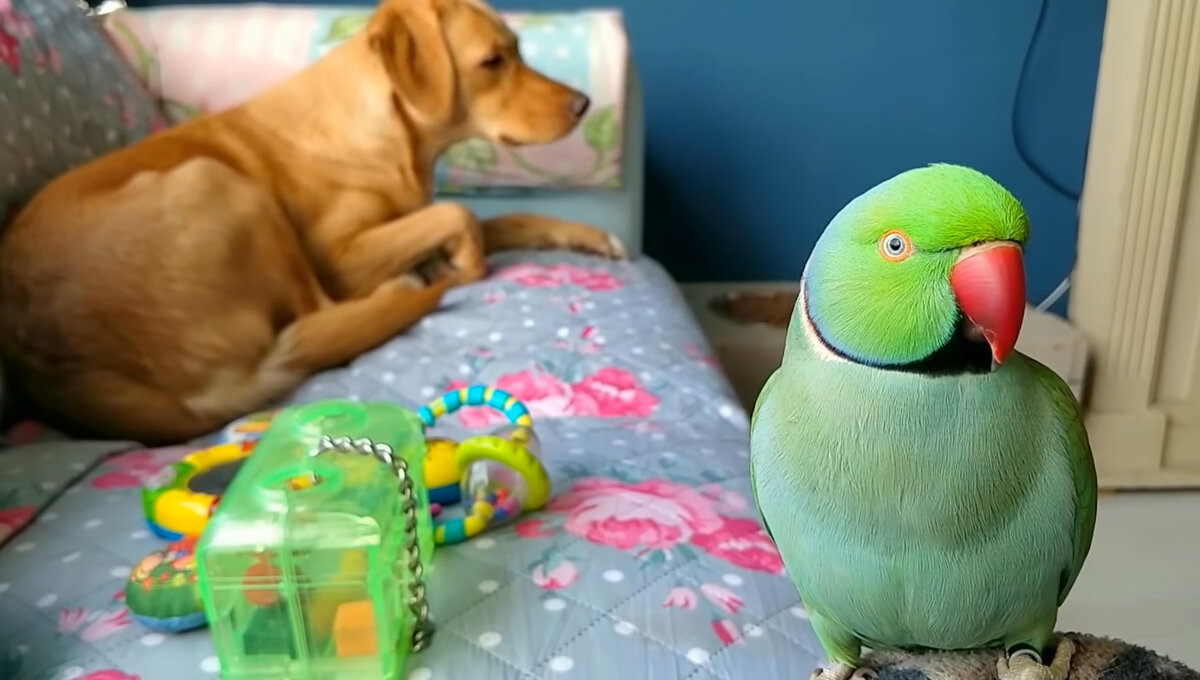 Попугай предпочитает передвигаться по дому верхом на собаке