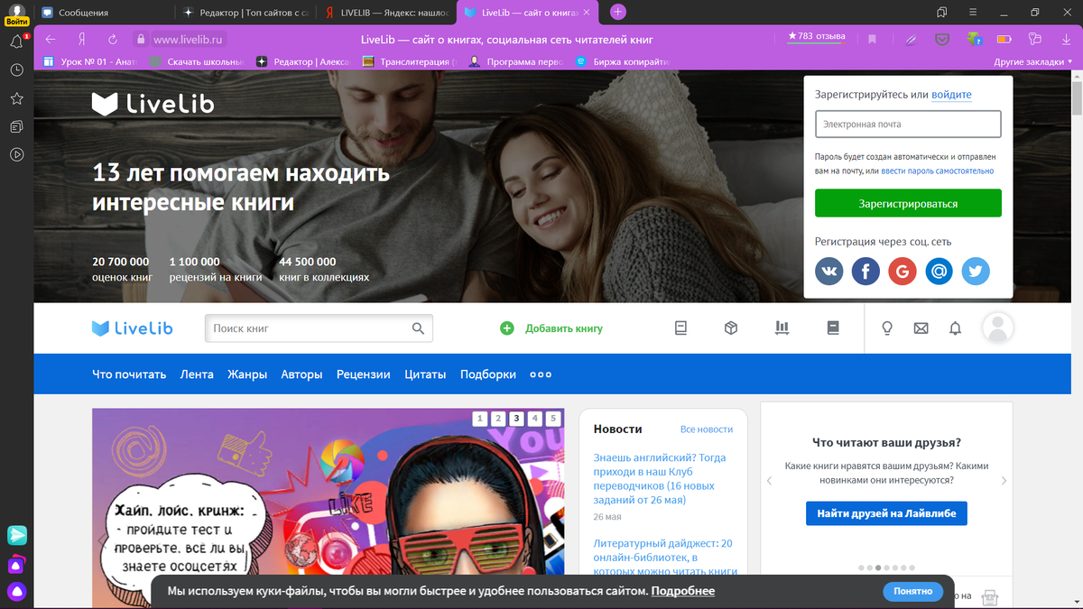 Вот уже какой год идет карантин, и внезапно на меня напало вдохновение, но я не знаю, с кем поделиться своим литературным творчеством. Мои многочисленные родственники все равно не оценят мои творческие позывы по достоинству, поэтому я стала искать сайты, где могу их выплеснуть в должной мере. И я их естественно нашла. Вот вам моя подборка интересных сайтов для творческих личностей, как я. 1. «LIVELIB» — СОЦИАЛЬНАЯ СЕТЬ ЛЮБИТЕЛЕЙ КНИГ www.livelib.ru Это известный в узких кругах интернет-проект или социальная сеть, посвященная литературе. На этом сайте мы можем найти информацию о книгах, писателях, издательствах и библиотеках. Также на нем есть обзоры и рецензии, сервисы статистики, форумы и блоги. Если вам понадобиться что-то опубликовать, то этот сайт отлично подойдет для вас, ведь он пользуется огромной популярностью на просторах рунета. 2. СТИХИ.РУ - ПОЭТИЧЕСКИЙ ПОРТАЛ www.stihi.ru Я, когда писала стихи, то пользовалась именно этим сайтом. Стихи.ру - это самый большой поэтичес