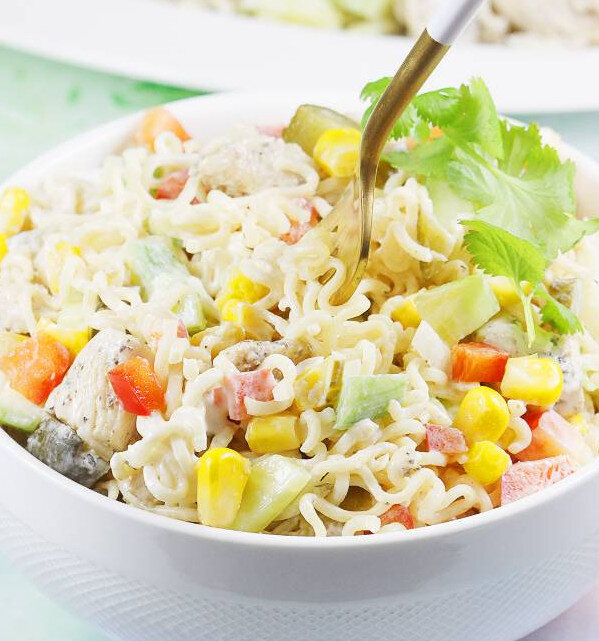 Для приготовления салата вам понадобятся две упаковки лапши быстрого приготовления . Выньте обе лапши из пакетов, раздавите и поместите в стеклянную миску или сковороду. Налейте в миску сухой лапши два стакана кипятка. Размешайте. Накройте миску крышкой или тарелкой на 3-5 минут .Процедите лапшу и оставьте для охлаждения. Очистить два куриных филе и нарезать кубиками / кусочками не более 2 см. Добавьте специи в миску с мясом, готовым к жарке: чайную ложку соли, чайную ложку прованских трав, щепотку простого перца. Тщательно перемешать и отложить в сторону. Начните нагревать большую сковороду с толстым дном. Налейте две столовые ложки масла для жарки. Через некоторое время положить все мясо,смешанное со специями. Жарить мясо чуть выше средней мощности горелки. Через несколько минут кусочки курицы будут обжарены. Переворачивайте кусочки мяса во время жарки. Положите готовое мясо в миску. Нар