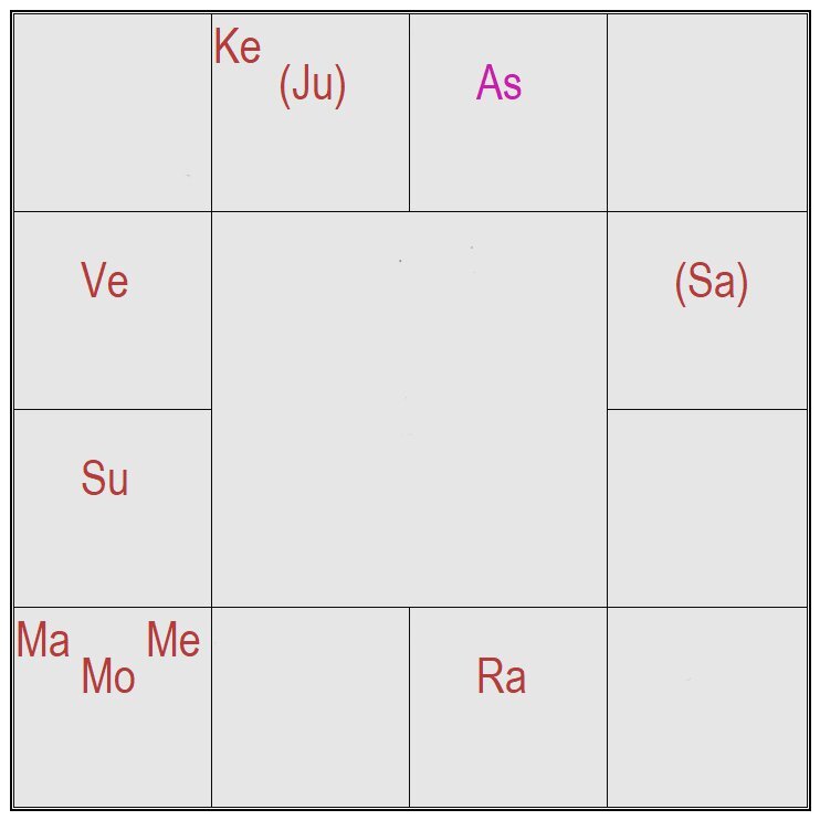 Прежде всего, хочу сказать, что эта статья не выражает моего отношения к женщинам, у которых нет мужа и детей. Здесь я просто привожу астрологический анализ гороскопа такого человека. Предыстория этого гороскопа достаточно проста. Хозяйка гороскопа пришла ко мне на консультацию в Вильнюсе. Как только я увидел карту, сразу спросил именно об этих двух сферах - семья и дети. Почему я задал именно эти вопросы, вы узнаете позже из моего анализа. Дама рассказала мне, что именно эти две сферы в её жизни проявлены хуже всего - она никогда не была замужем и у неё никогда не было детей. Более того, она никогда не была беременна. Согласитесь, это достаточно редкая ситуация. Давайте посмотрим на этот гороскоп. Данные: 17.01.1977, 13:10, Вильнюс Рассмотрим 7 дом, именно он напрямую связан с семейной жизнью. Для удобства я выделил его цветом. Я оставил яркими только планеты, оказывающие влияние на 7 дом и естественного караку 7 дома (Юпитер): Сатурн. Эта планета оказывает влияние на Юпитер, который