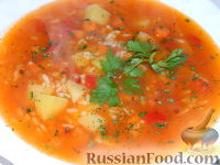Продукты: Рис - 150 г Томат-паста - 3 ст.л. Перец болгарский - 1 шт. Лук репчатый - 1 шт. Морковь - 1 шт. Картофель - 3-4 шт. Смесь перцев - 0,5 ч.л. Соль - по вкусу Вода - 2 л Зелень - по вкусу Растительное масло - 2 ст.л. Чеснок - 2 зуб Лавровый лист - 1-2 шт. Приготовить все продукты для томатного супа с рисом. Как приготовить томатный суп с рисом:
