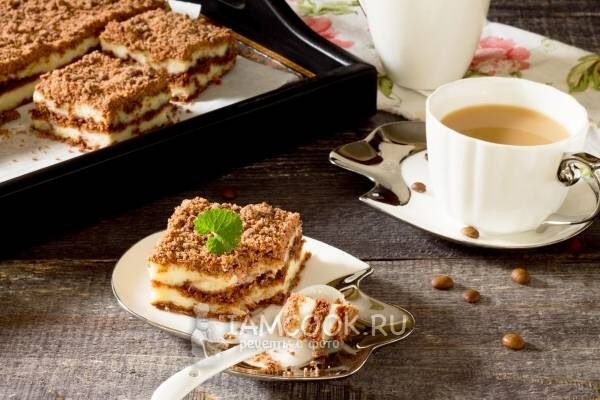 Ингредиенты Песочная крошка: Сахар - 120 г Мука - 300 г Разрыхлитель для теста - 1 ч.л. Какао - 3 ст.л. Сливочное масло - 200 г Творожная начинка: Творог - 600 г Сахар - 1 стакан Ванилин или ванильный сахар - по вкусу Яйцо - 2 шт. Крахмал - 1 ст.л. с горкой Процесс приготовления Пирог с творогом на скорую руку очень вкусный, легкий в приготовлении и выпекается всего 30 минут. Для этого вкусного шоколадно-творожного пирога даже не нужно замешивать тесто, для него готовится песочная крошка. Сам пирог получается нежным, сладким, с хрустящей сверху корочкой, которая похожа на штрейзель. Я делала два творожных слоя, можно делать 1 творожный слой в пироге, тогда песочную крошку делите на 2 части. Для приготовления пирога с творогом на скорую руку подготовьте продукты по списку.  Соединяем какао, сахар, муку и разрыхлитель.  В мучную массу трем на крупной терке сливочное масло и перемешиваем ложкой или руками.  Для начинки соединяем творог, яйца, сахар, ванилин и к