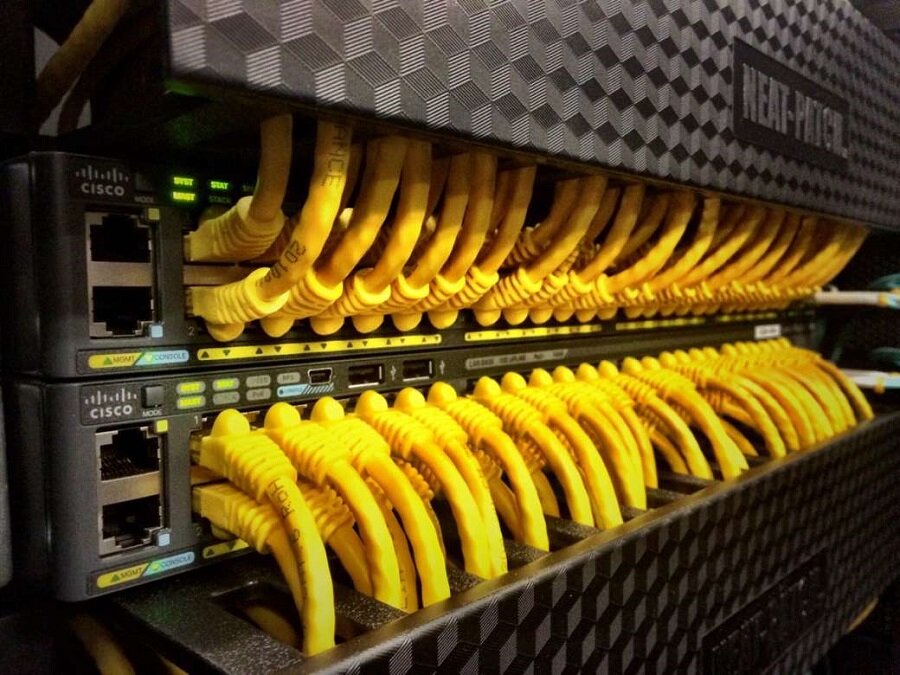 Горизонтальные кабельные организаторы устанавливаются в стойку и обеспечивают подвод кабелей к патч-панелям или коммутаторам и прочему оборудованию. Для подвода к патч-панелям не имеет значения где монтировать организатор, сверху или снизу. Как удобнее, так и монтируйте. При использовании совместно с коммутаторами организатор лучше расположить так, чтобы индикация коммутатора была видна. Если индикаторы на коммутаторе расположены снизу, то организатор лучше разместить над коммутатором. На фото ниже линки верхнего коммутатора видно, а у нижнего — нет. Обычно такое случается, когда один организатор используют сразу для двух устройств сверху и снизу. Если есть возможность, то ведите кабель к порту по кратчайшему пути так, чтобы с левой половины коммутатора провода уходили влево, а с правой — вправо, это минимизирует количество проводов в организаторе. Есть даже специальные коннекторы под углом в 45°. Иногда (даже часто) нет возможности разнести провода в стороны, в этом случае получается