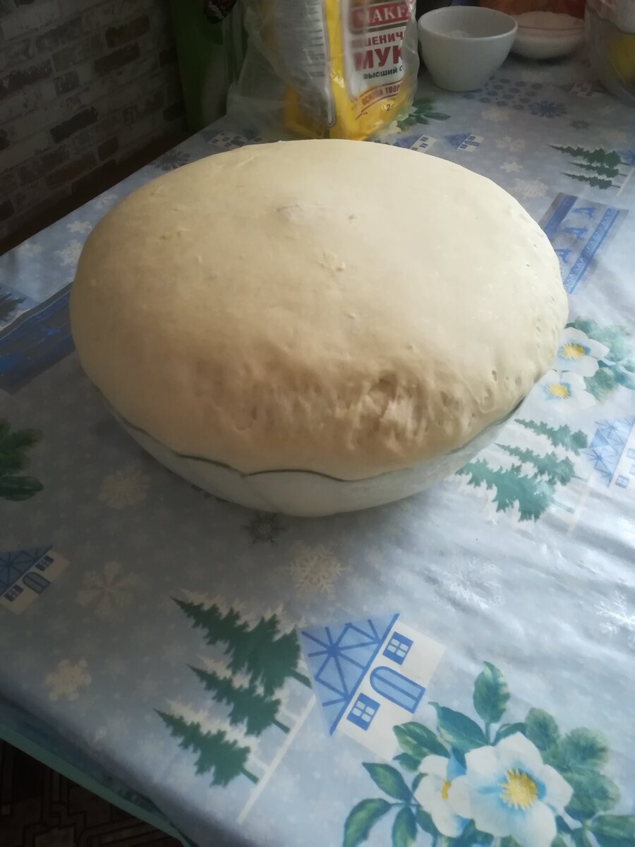 Тесто для брожения отправляется на два-три часа в тепло.Накрываем полотенцем. Ждем, когда колобок увеличится в объеме втрое.