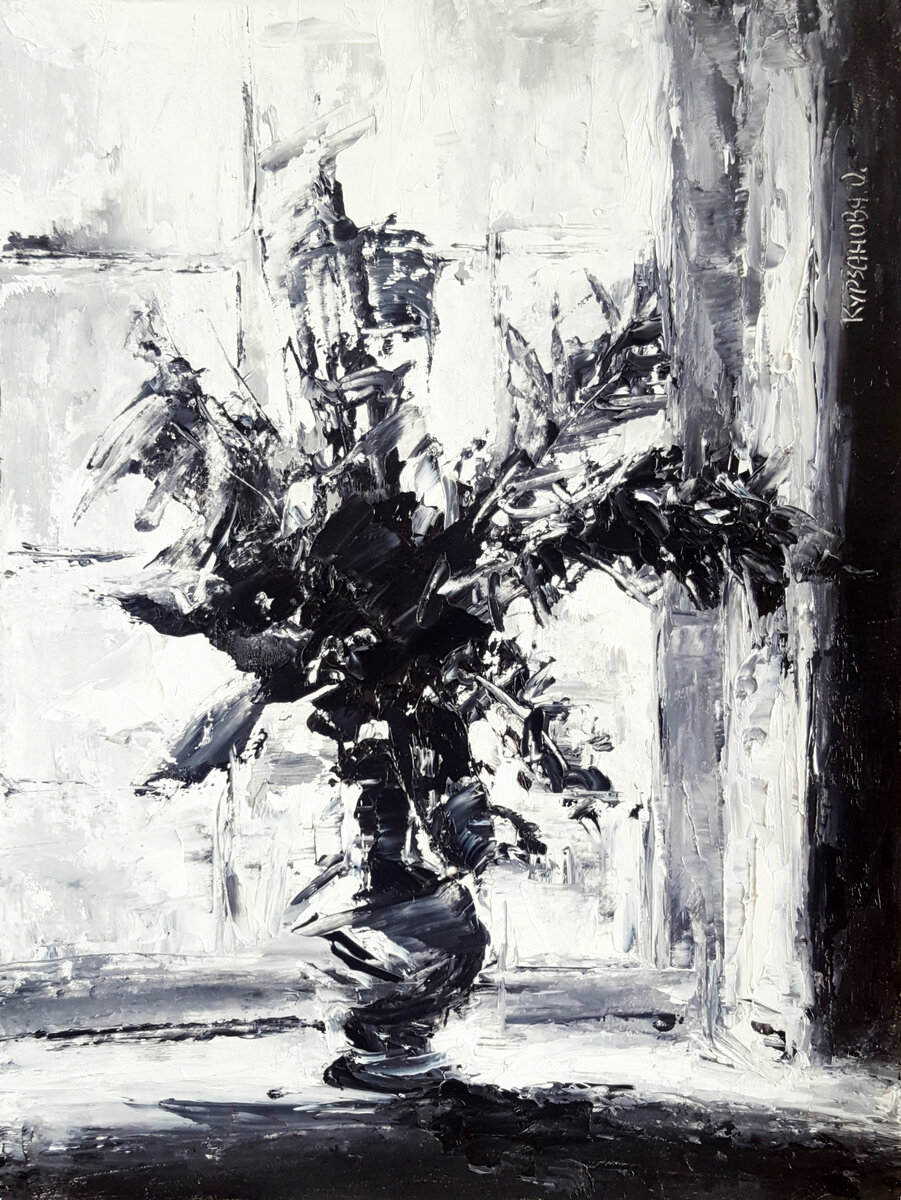 Цветочный натюрморт — пожалуй, единственный живописный жанр, который нравится всем! Буйство оттенков, игра света на поверхности лепестков — кусочек живой природы, источник радости и вдохновения. Но что если «выключить» цвет? На первый план сразу выходит причудливость линий и форм, особое видение автора — и розы становятся чем-то большим, чем просто красивым цветком… Этим и привлекательны картины столичной художницы Ольги Курзановой: они таят в себе парадоксы, но в то же время их можно представить в любом интерьере — от классики до модного лофта. Ольга Курзанова: «Я люблю полевые цветы: у них своя романтика — наивная, теплая, настоящая. Люблю созерцать в природе поля тюльпанов, огромные подсолнухи, кустовые розы… Цветы — символ красоты для меня, они довольно легко даются художнику, если их чувствуешь. Правда, когда работаешь мастихином, а не кистями, задача несколько усложняется: тут нужна «рука мастера», чтобы вышло «живенько», а не декоративно!» — Около десяти лет назад я побывала в