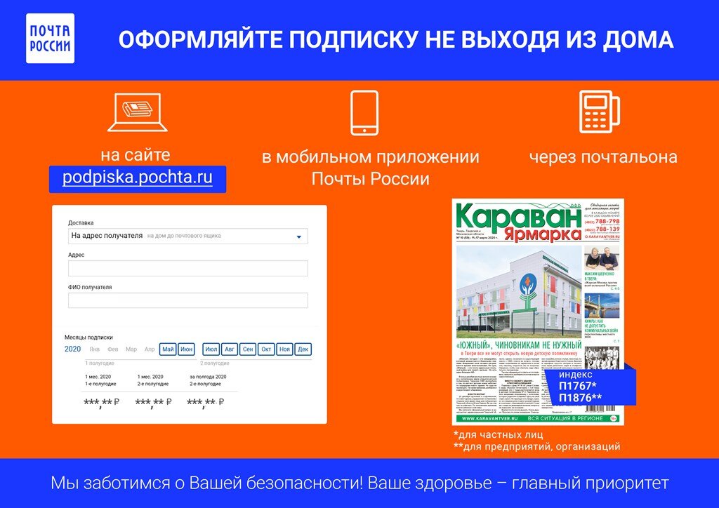 В рамках Всероссийской декады подписки можно оформить подписку на газету «Караван Ярмарка» по льготной цене. С 1 по 10 июня пройдет Всероссийская декада подписки, в ходе которой во всех почтовых отделениях Твери и Тверской области, а также на сайте «Почты России» можно будет подписаться на издания со значительными скидками. Подпишитесь на нашу газету «Караван Ярмарка» не выходя из дома одним из способов: через сайт «Почты России», мобильное приложение, а также с помощью почтальона. Как это сделать через сайт: Как это сделать через мобильное приложение: Подписные индексы на газету «Караван Ярмарка: