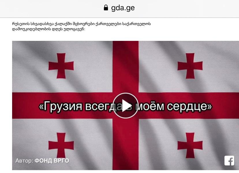 Флешмоб «Грузия всегда в моём сердце» с участием грузинской молодежи из 14 городов России опубликован на официальном сайте Департамента по делам диаспор Министерства иностранных дел Грузии. «Грузины, живущие в разных странах, работающие за рубежом, представляющие грузинское искусство и диаспорную деятельность, поздравляют нашу родину с национальным праздником - с Днём независимости Грузии», - говорится в сообщении Департамента. На сайте также представлены поздравления грузинских диаспор из Франции, США, Великобритании, Дании и других стран. Напомним, что 26 мая 2020 года вышел видеоролик «Грузия всегда в моем сердце», приуроченный к празднованию Дня независимости Грузии. Идея флешмоба принадлежит Департаменту по делам диаспор Фонда возрождения и развития русско-грузинских отношений. Президент Фонда – общественно-политический деятель Давид Цецхладзе.
