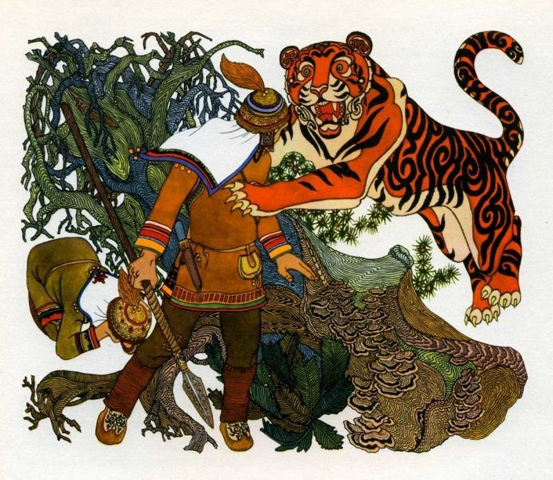 Шли, шли братья… Индига по сторонам смотрит. Вдруг какой-то шум слышит… Повернулся… А на старшего брата из-за валежины тигр прыгает! Тот и копья не наставил, и нож вынуть не успел. Индига дальше был. Ему бы копьё в тигра бросить! А у Индиги заячье сердце сделалось: испугался младший брат. На землю упал, руки сложил, тигра просит мимо идти, их с братом не трогать! Долго так лежал Индига. Потом голову поднял, смотрит — ни тигра, ни брата нет. Оба пропали. Никаких следов не видно… Защемило у Индиги сердце. Стал он брата звать. Кричал, кричал, да никто не отзывается, только сопки его крик передразнивают: