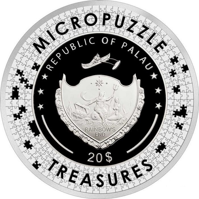 По заказу государства Палау выпущена монета с изображением паззла, вырезанного из картины Огюста Ренуара "Две Сестры". Монета, выпущенная в серии "Сокровищница Микропаззла" (Micropuzzle Treasures), состоит из трех уровней, отчеканенных благодаря технологии, позволяющей воспроизводить эффект вертикального рельефа. Изображения имитируют разобранную часть пазла, основной уровень с картиной и элементы, лежащие на пазле. На реверсе отчеканена часть картины Две сестры (на террасе) французского художника Пьера-Огюста Ренуара. На реверсе монеты отсутствует кант, и элементы отчеканены до самой границы монеты. На аверсе в центре показан герб Палау, также выполненный в виде паззла. Сверху и снизу отчеканено название серии - "Micropuzzle Treasures". Страна - Республика Палау, номинал - 20 долларов, металл - серебро 999-й пробы, диаметр - 65 мм, вес - 93,3