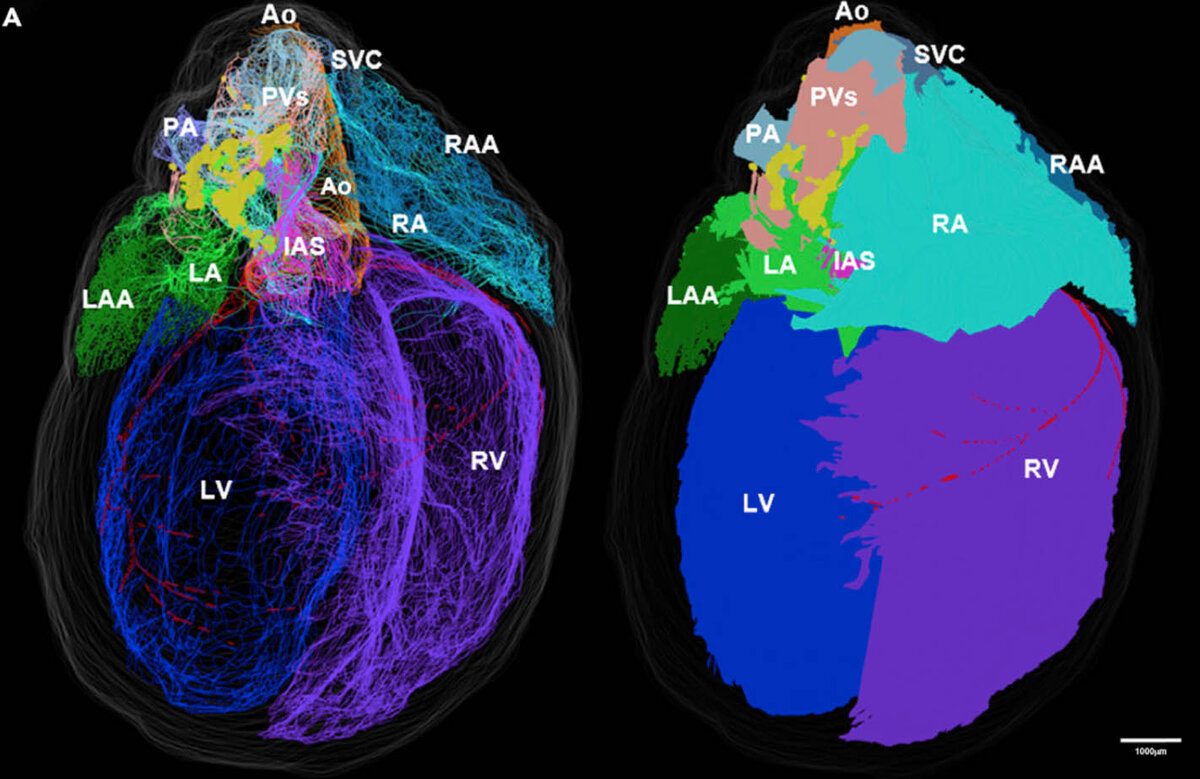 Credit: Sirisha Achanta et al/iScience, 2020 Перед вами — первая карта внутрисердечных нейронов (intrinsic cardiac neurons, ICN), которая создана в 3D-формате и опубликована в журнале iScience группой исследователей из США под руководством Джеймса Швабера (James Schwaber) из Университета Томаса Джефферсона. Речь пока идет о нейронах крысы, но впоследствии в планах — сердце свиньи и человека. Читайте материалы нашего сайта в Facebook, ВКонтакте, Яндекс-Дзен, Одноклассниках и канале в Telegram, а также следите за новыми картинками дня в Instagram