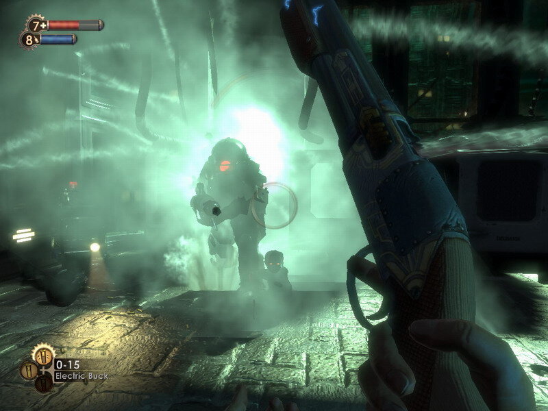 Но главная «фича» BioShock — это плазмиды, специальные устройства, вставляющиеся в тело нашего героя и дающие ему новые возможности или улучшающие старые. Выбор просто фантастический: тут вам и телекинез (очень приятно швыряться во врагов кухонной утварью, трупами, брошенными ими же гранатами), и электрошок, и даже способность подчинить себе на некоторое время Большого Папочку. За использование всех этих финтифлюшек приходится платить Евой — местным аналогом маны, восстановить которую можно только при помощи специальных аптечек. Есть и пассивные, ничего не расходующие плазмиды — повышающие количество здоровья, упрощающие процедуру взлома и т. д.