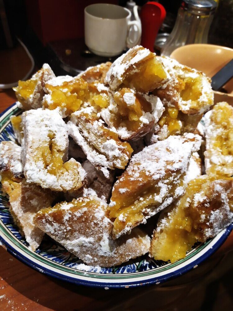 Когда пирог готов, разрезаем его ромбиками и каждый кусочек обваливаем со всех сторон в сахарной пудре.
