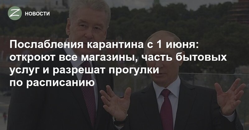 С 1 июня в Москве откроют все непродовольственные магазины и часть бытовых услуг: смогут работать прачечные, химчистки, ремонтные мастерские «и так далее» (точный список неизвестен). Также разрешат прогулки с членами семьи по расписанию. Об этом мэр Москвы рассказал на встрече с президентом Владимиром Путиным. С понедельника все жители, включая людей старше 65 лет и с хроническими заболеваниями, могут выходить из дома для прогулок и занятий спортом. Откроются все парки и зеленые территории. Детские и спортплощадки остаются закрытыми. При этом на улицах надо будет носить маску. Будет установлен определенный график прогулок. Заниматься спортом на свежем воздухе можно ежедневно до 9:00 утра. На пешие прогулки можно выходить с 9:00 до 21:00 не более трех раз в неделю – два раза в будни и один раз в выходной. График "прогулочных дней" для жителей каждого дома будет опубликован в интернете. (подробные правила - по ссылке в первом комментарии) «Непростое решение, — сказал Собянин Путину. —
