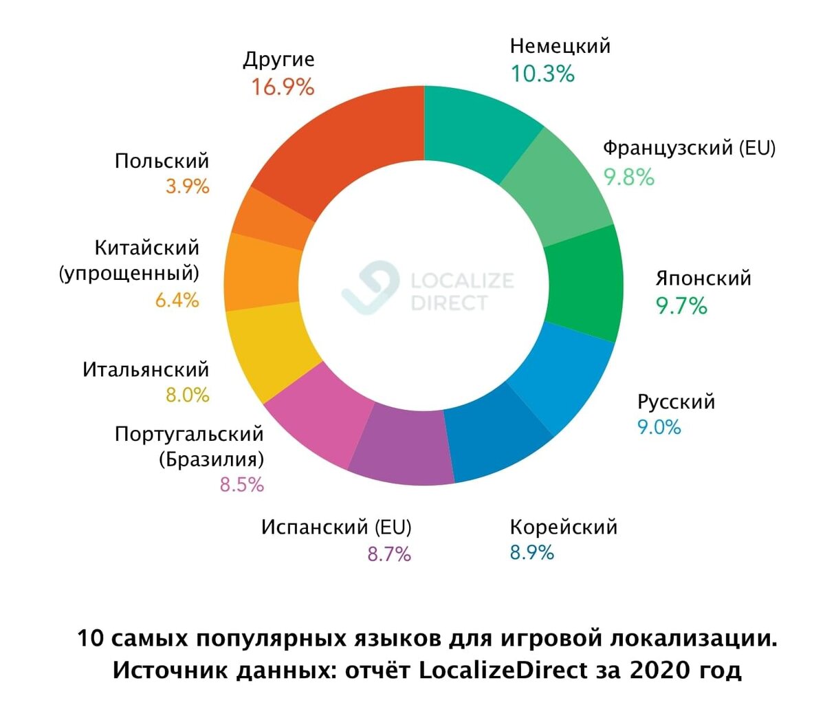 По данным LocalizeDirect за 2019 год, 10 самых популярных языков для игровой локализации — это немецкий, французский (европейский), японский, русский, корейский, испанский (европейский), португальский (бразильский), итальянский, упрощённый китайский и польский. На эти 10 языков (из пула 48) приходится более 80% объёма текста для перевода. Тренды локализации игр Как правило, языки FIGS — французский, итальянский, немецкий, испанский — неотъемлемая часть игровой локализации. На эти языки приходится 40–45% всего объёма текста для перевода. Сейчас их доля снизилась до 37%: итальянский и европейский испанский стали менее востребованными. Упрощённый китайский, используемый в материковой части Китая, потерял 3 процентных пункта: по сравнению с прошлым годом его доля снизилась с 9% до 6%. Отчасти на это повлияла девятимесячная заморозка выдачи лицензий иностранным играм в КНР в 2018 году. Несмотря на это, разработчики всё ещё считают Азию перспективным регионом — из-за большой численности нас