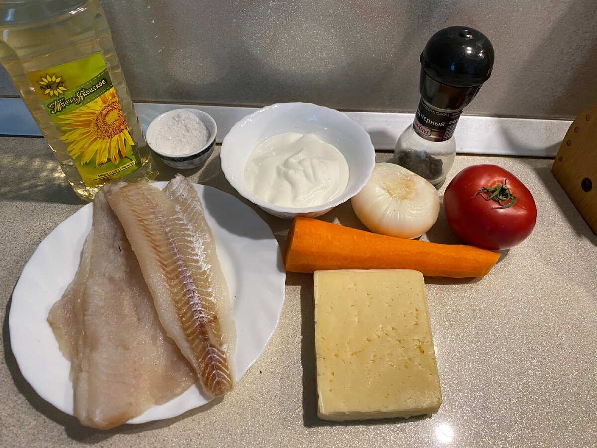 Честно сказать я не большой фанат рыбы, для разнообразия можно конечно, но по мне лучше мясо, кусок прожаренный и сочный. Ну так вот) В морозилке оказался пакет с филе минтая и решила я его приготовить пп-шно))) Ингредиенты: 1.Лук режем полукольцами, морковку трём на крупной терке. 2.Разогреваем сковороду, наливаем немного масла и отправляем пассироваться лук. 3.Когда лук станет мягким добавляем к нему морковь, перчим и ещё обжариваем. 4.Лук и морковь выкладываем в форму и распределяем по дну. 5.На овощи выкладываем филе. Я его поделила пополам, получилось 4 таких кусочка. Солим. 6.Сверху выкладываем кружочки помидора 7.Сыр трём на крупной терке и выкладываем сверху помидора. 8.На сыр выкладываем по 2 чайные ложки Сметаны и немножко распределяем. Сметану можете заменить майонезом. Отправляем нашу рыбку в предварительно разогретую до 180 градусов духовку на 20 минут. Вот такая сочная и вкусная рыбка получается))) Приятного аппетита!!! Если Вам понравился рецепт ставьте