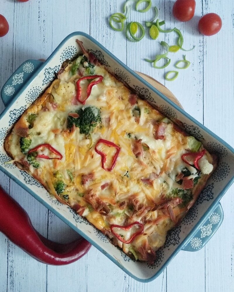 Сыр. Приготовление: - Капусту слегка отварить, откинуть на дуршлаг и выложить в форму. Сверху порезать бекон.