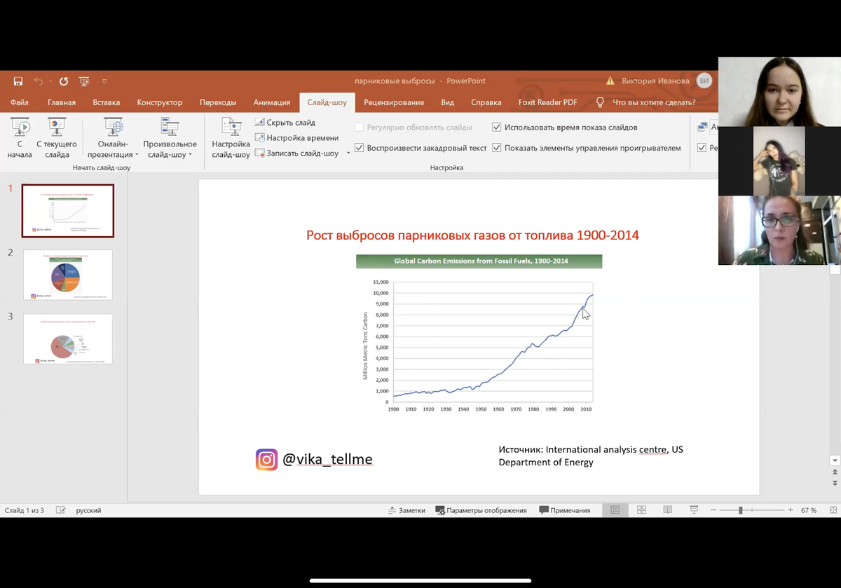 После этого, Виктория продемонстрировала, как менялись показатели выброса парниковых газов от топлива в период 1900-2014 годов. Спикер обратила особое внимание на резкий скачок в росте в 1970 году; а за последние 50 лет выбросы выросли на 90%.