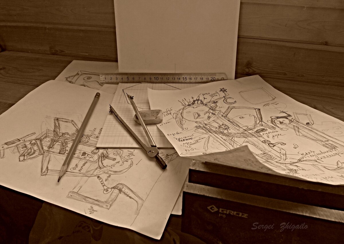 Вспоминаю о своих работах, созданных в разные периоды. Вот ещё одна деревянная скульптура стоит передо мной. Сколько их уже сделано, не знаю... Надо будет посчитать как-нибудь. Большая, выше метра получилась. Приятный размер для интерьера частного дома. Работа непростая - и технически, и по смысловой наполненности. Поэтому и продвигалась не быстро. Пришлось изготавливать и подгонять большое количество деталей, это стало определённым вызовом для меня. А началось всё с очередных набросков, которые я нарисовал после того, как мой разум посетил новый персонаж: И пошло-поехало. Строгаю наоборот - надо выстругать так, чтобы на поверхности были живописные ступеньки и неровности. Материал - ольха: Идём дальше. Каждую деталь надо вымерять, отдельно сделать и подогнать. А таких деталей ох как немало: Вот такая голова выстругалась для нашего Пиноккио/Наполеона: Сборка-подгонка, ну куда без этого: Ну вот, всё готово. Странный получился персонаж, но именно над такими созданиями работать интереснее
